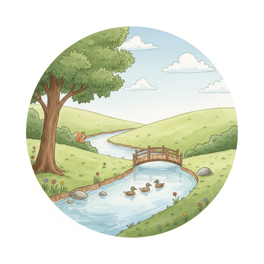 - 小さな川(例:田舎の小川):”a small stream” や “a creek” を使うと自然。状況によって “brook” も詩的な響きを持ちます。